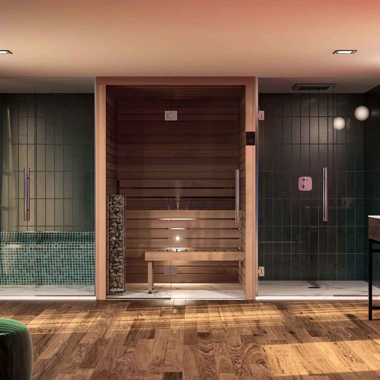 Auroom Cala Glass 59×71: A 3-Person Indoor Sauna Kit with Full Glass Front