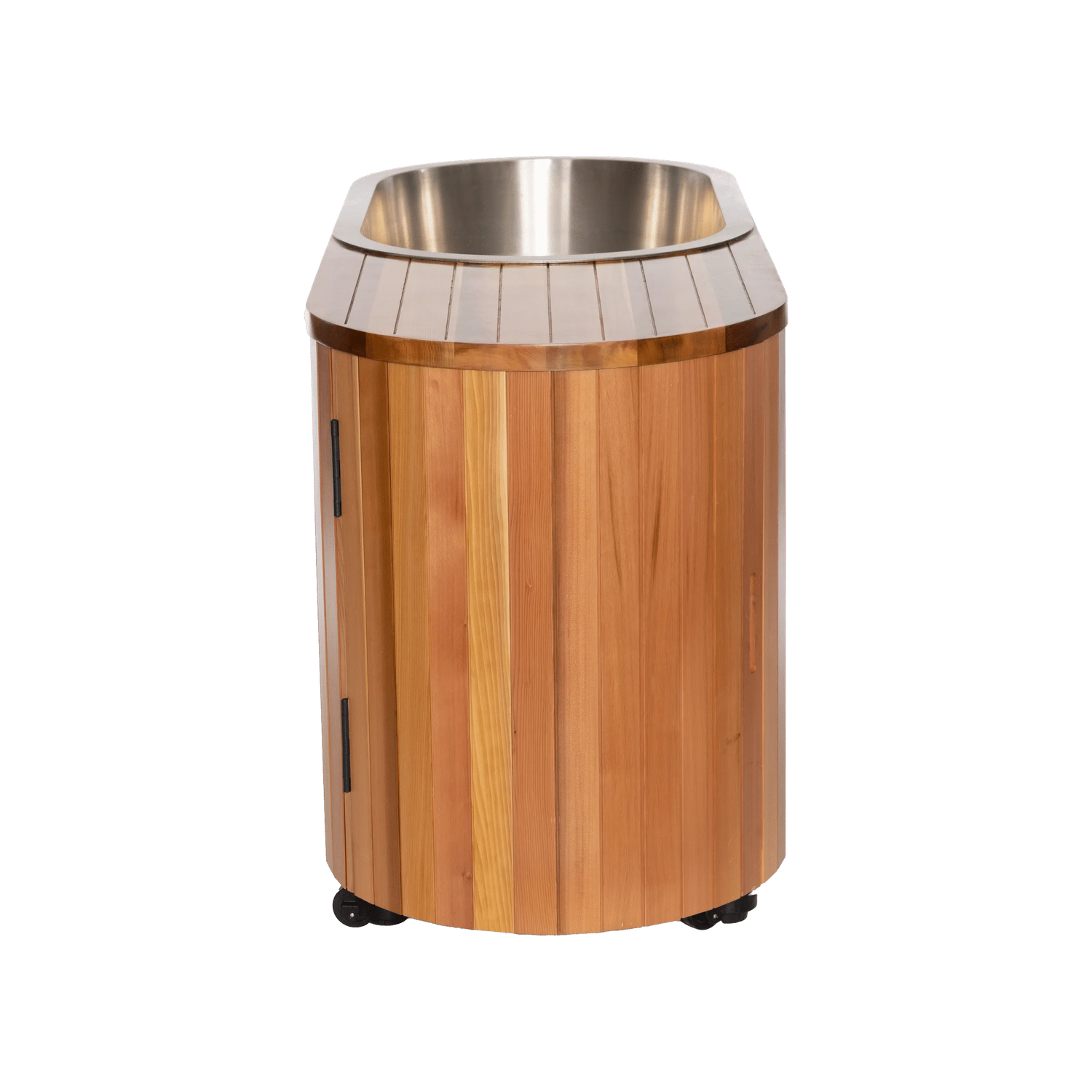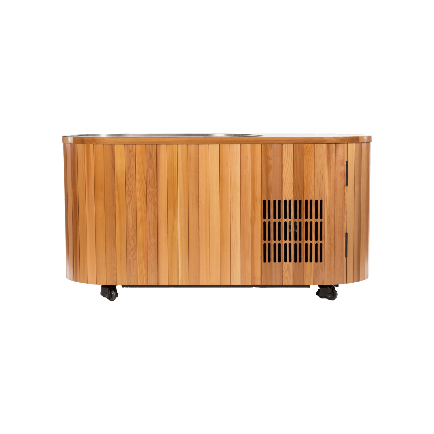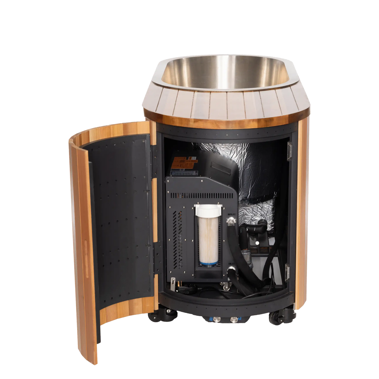 The tub interior is brushed SS304 stainless steel — marine-grade, corrosion-resistant, and easy to clean. The exterior is handcrafted Canadian Cedar for natural beauty and durability. The structural frame uses galvanized steel. The insulated lid features a water-resistant finish with a practical handle and foldable design for easy storage.